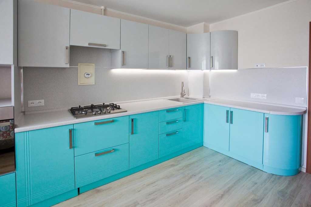 Поскольку в кухнях такого типа допускаются плавные линии, вы можете остановиться на вариантах с закругленными углами и «радиусными» фасадами.