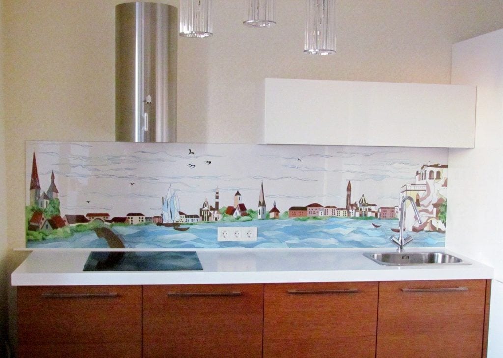 Кухонный фартук из такого материала не притягивает грязь и довольно просто чистится. Стекло может быть прозрачным и служить защитам обоям или другой отделки с низким уровнем износостойкости. Также существуют варианты окрашенных, зеркальных и тонированных отделочных изделий. Особой оригинальности придают интерьеру стекла с фотопечатью.