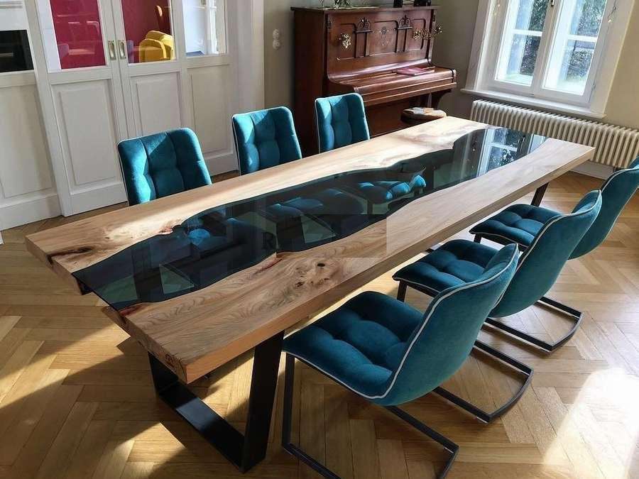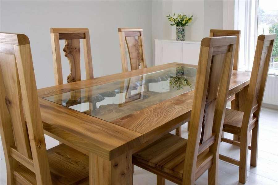 Деревянный массивный обеденный стол имеет необычную конструкцию. Столешница выполнена из двух пластов древесины. Посередине столешницы имеется вставка из закаленного стекла.