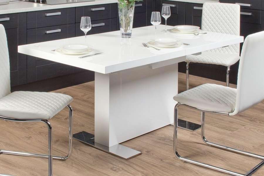 Прямоугольный обеденный стол со столешницей из закаленного стекла. Стол оснащен хромированными ножками и двумя раскладными модулями столешницы.