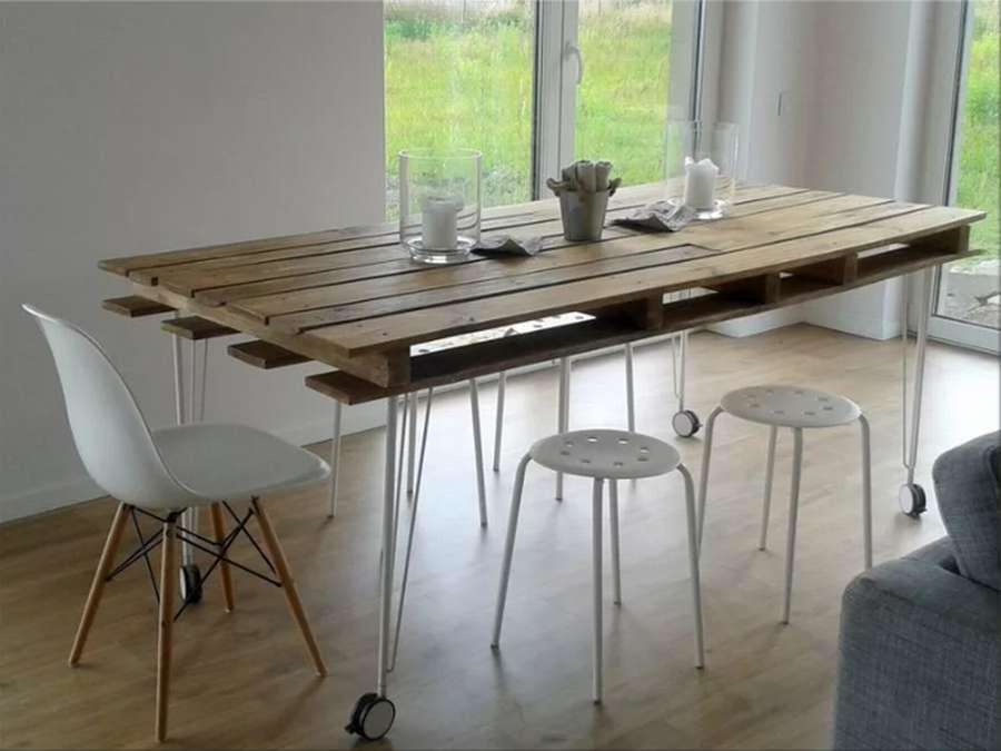 Самодельный обеденный стол выполнен из старых поддонов. Ножки стола выполнены из металлических прутьев. Ножки также оснащены колесиками.