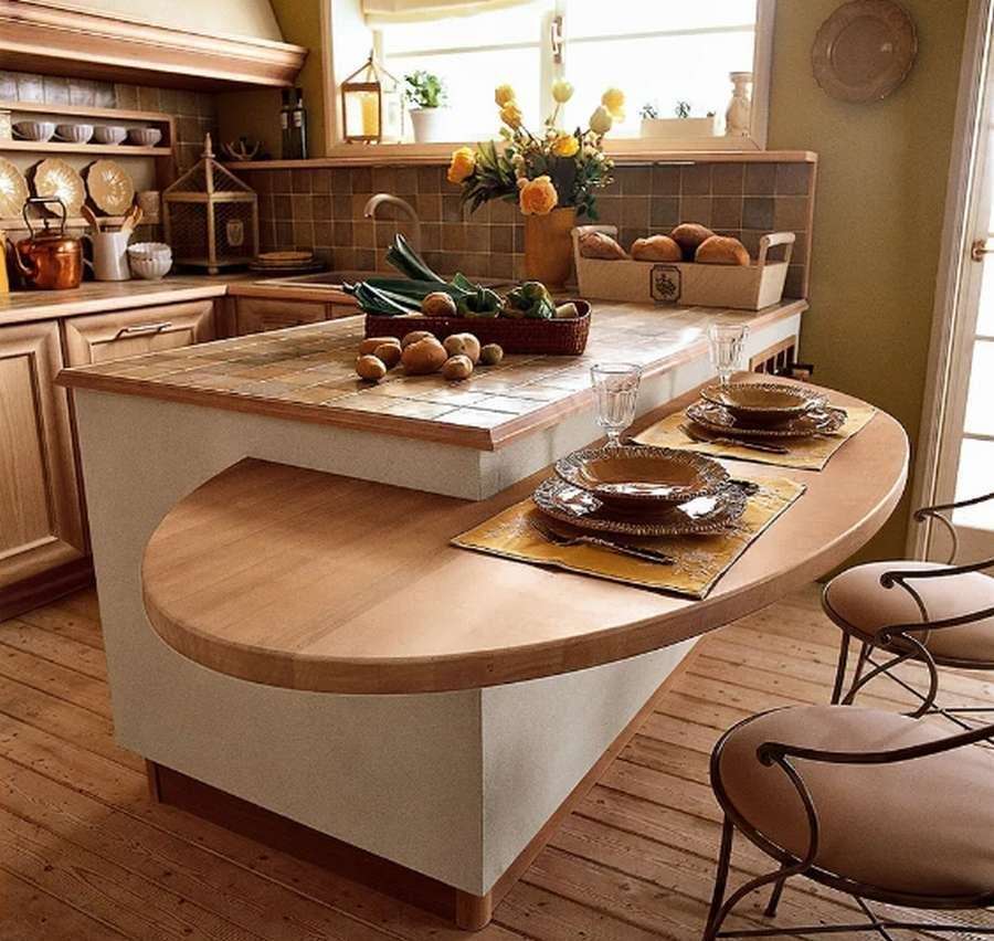Он акцентирует на себе внимание, когда гости заходят на кухню. Есть еще одно преимущество, если квадратные метры позволяют, можно сделать большой круглый стол, украсив блюдами, цветами и красивыми фужерами, всегда будет создаваться впечатление роскоши.