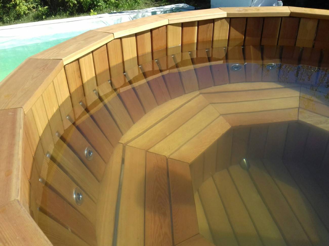 Кедровая уличная ванна с подогревом на дровах имеет привлекательный, стильный внешний вид, может десятилетиями препятствовать гниению, образованию плесени внутри чаши. Помимо этого после нагревания воды, материал наполняет воздух приятным кедровым ароматом, кислоты и масла проникают в воду, обеспечивая больший оздоровительный эффект.