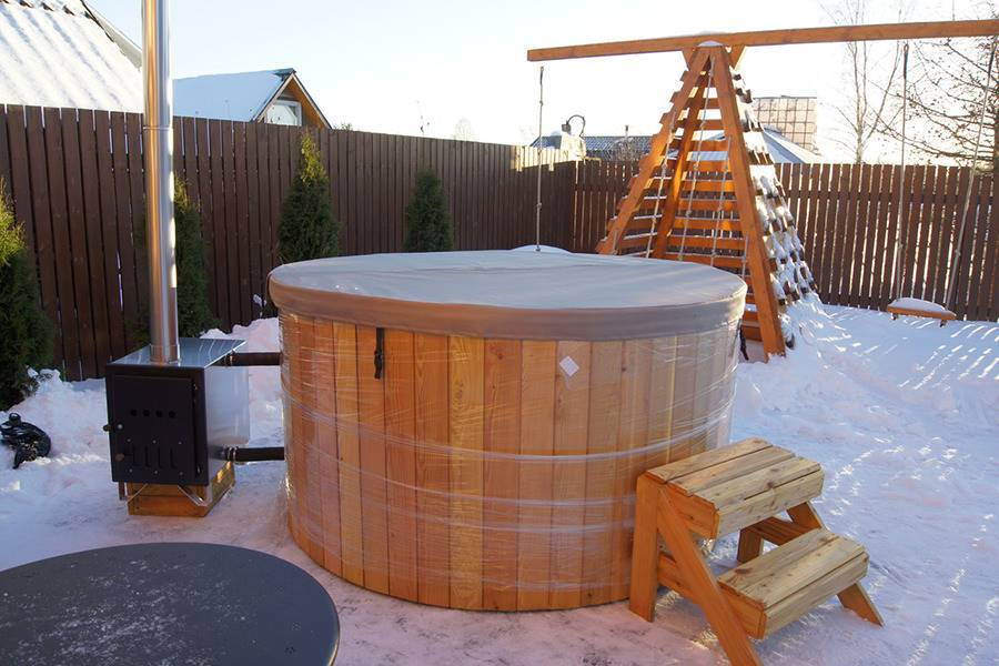 Кстати, есть вариант горячей купели. По сути, это просто ванна, но на улице. Ощущения от такого купания весьма приятные, особенно когда на улице мороз.