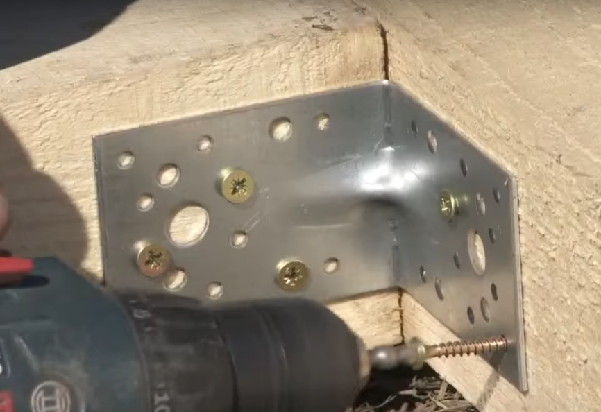 Шаг 3. Если в качестве материала для фундамента выбран брус – сколотите из него прямоугольную коробку по размеру теплицы, используя в качестве крепежа усиленные уголки и саморезы по дереву.