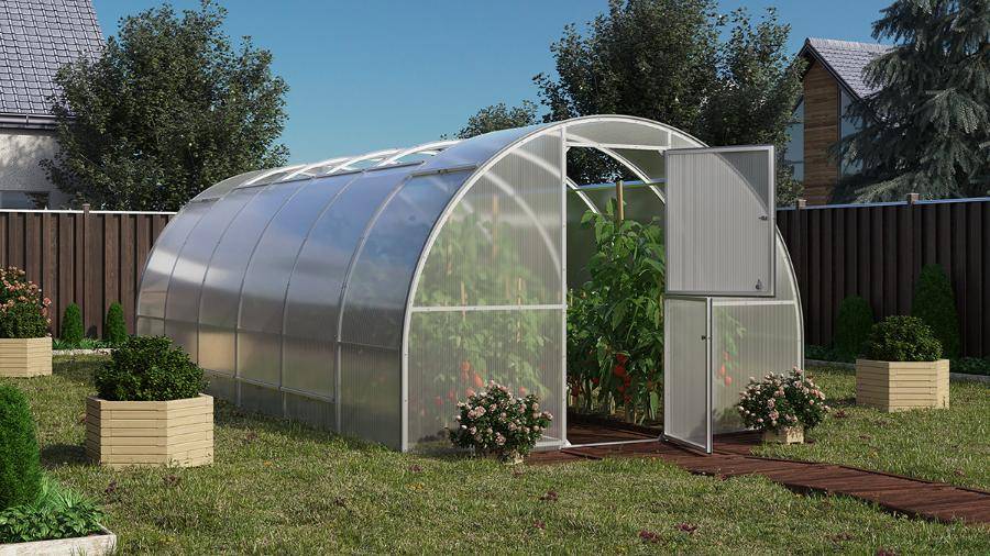 - Высокую прочность: вне зависимости от размера теплицы, она будет обладать высокой прочностью и устойчивостью без дополнительных опор. Это обеспечивается равномерным распределением массы по всем деталям постройки.