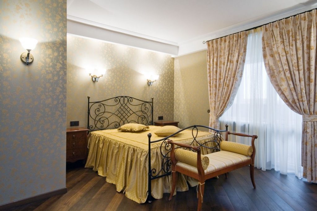 Особое внимание следует уделить декоративным элементам: можно расставить тяжелые канделябры, использовать изящную фурнитуру цвета золота, повесить большую люстру. Ламбрекен должен соответствовать такому великолепию