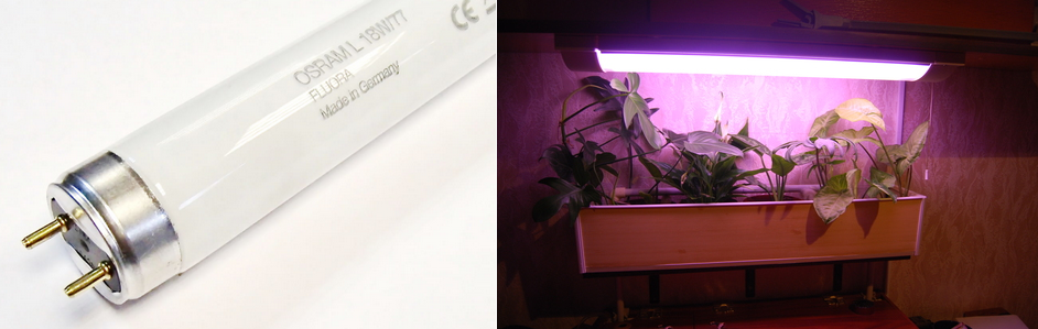 Если подсветка растений осуществляется с помощью люминесцентных (они же флуоресцентные) ламп, желательно приблизить спектр к естественному, совмещая их с другими источниками освещения. Использование только газоразрядного светильника допускается для флоры высотой не более 1 метра. Другие растения требуют совмещения двух ламп — люминесцентной и накаливания. При этом для сохранения постоянной интенсивности света газоразрядные источники должны меняться не реже 1 раза в год. Большой популярностью пользуется лампа OSRAM FLUORA, понравившаяся многим из-за доступности.
