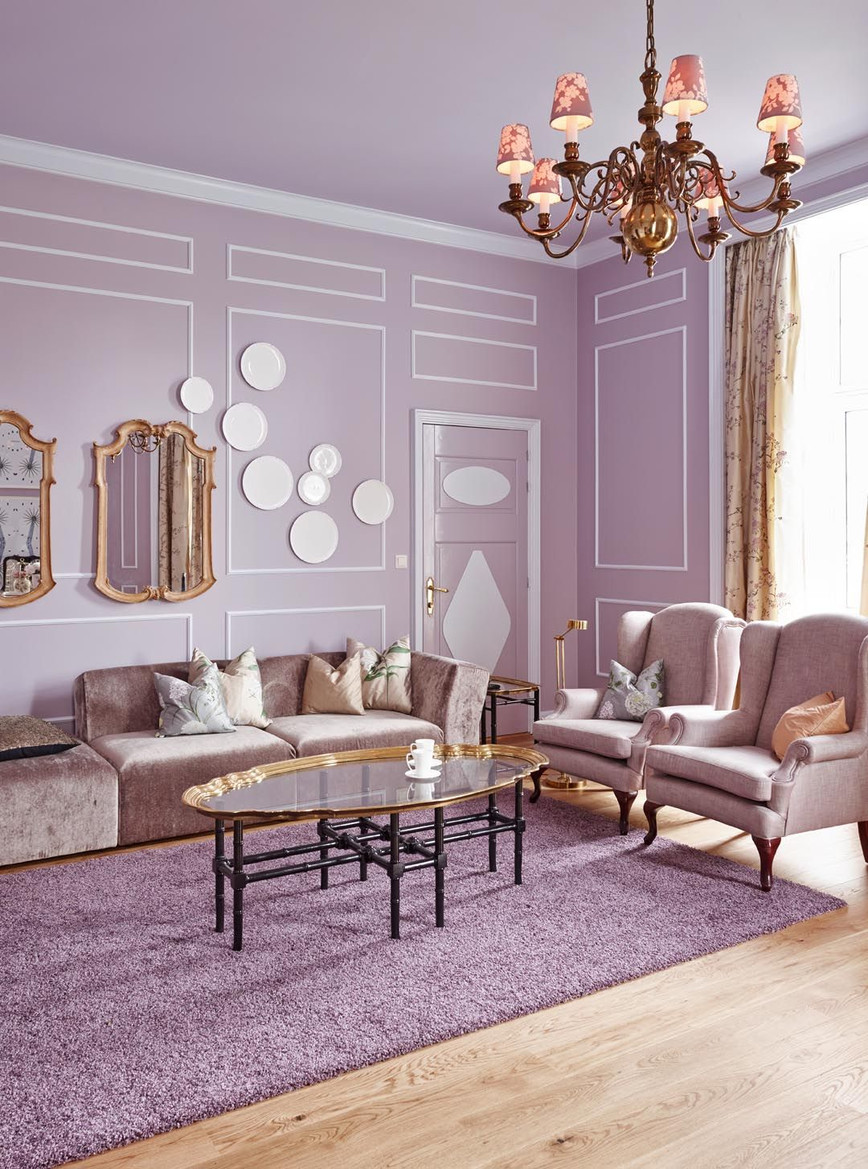 Если стоит задача оформить интерьер в стиле ретро, можно смело комбинировать бледно-лиловый с любыми пастельными цветами, будь то персиковый, голубой, салатовый и т.п.