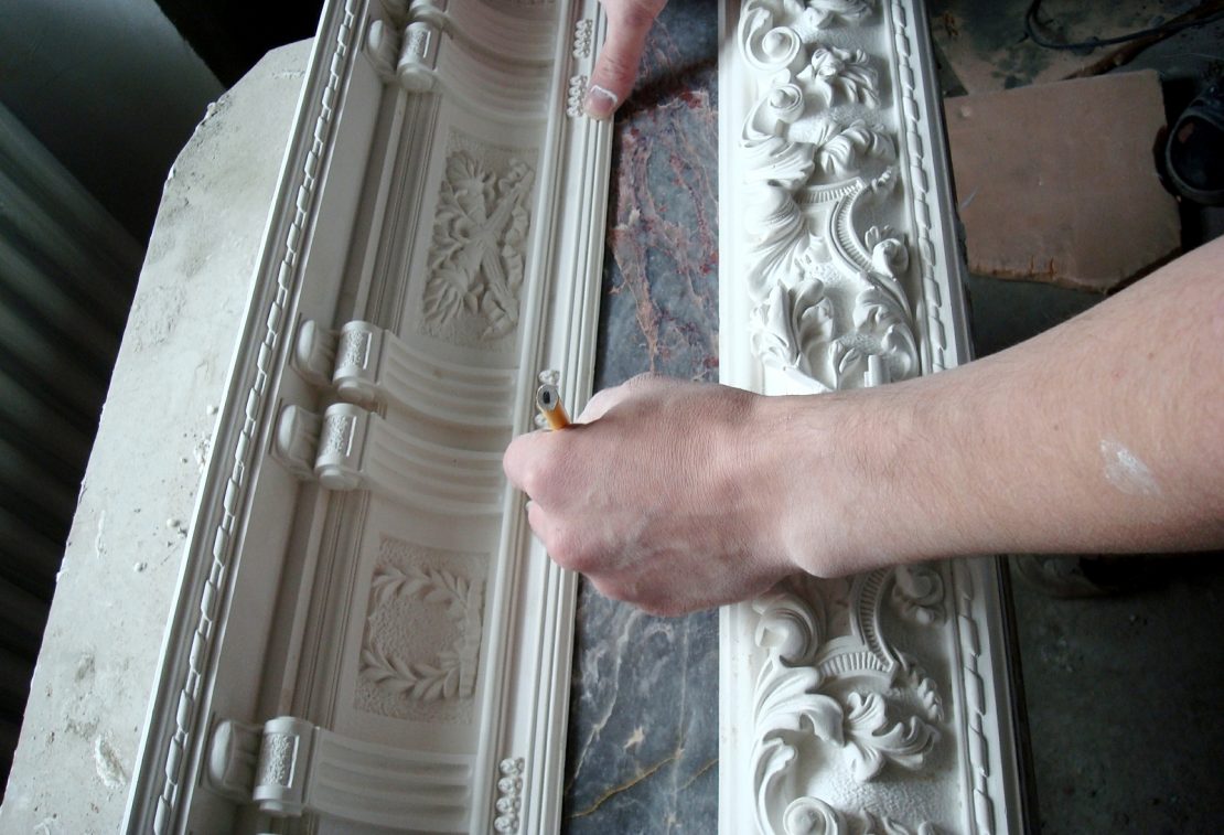Для изготовления лепнины замешивают гипсовый раствор. Гипс марки от Г4 до Г7 разбавляют водой, смешанной с клеем ПВА. Раствор должен иметь консистенцию кефира. Смесь выливают в форму, обработанную разделительной смазкой, удаляют воздух кистью и выравнивают поверхность шпателем. Смесь полностью застывает через несколько часов. Деталь из формы вынимают, постукивая по дну. Сутки изделие должно дополнительно просохнуть вне формы. Неровности на поверхности устраняют мелкой наждачкой, а раковины заполняют раствором. После этого поверхность обеспыливают и грунтуют. Внешнюю сторону декора красят краской.