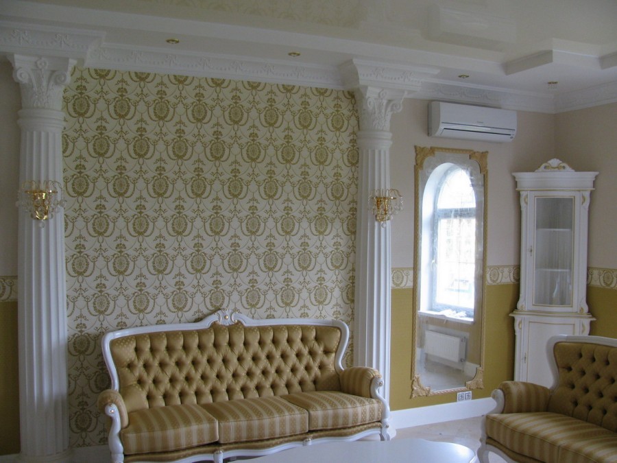 Очень эффектно смотрятся в помещении декоративные колонны из лепнины, придавая ему зрительно дополнительную высоту: