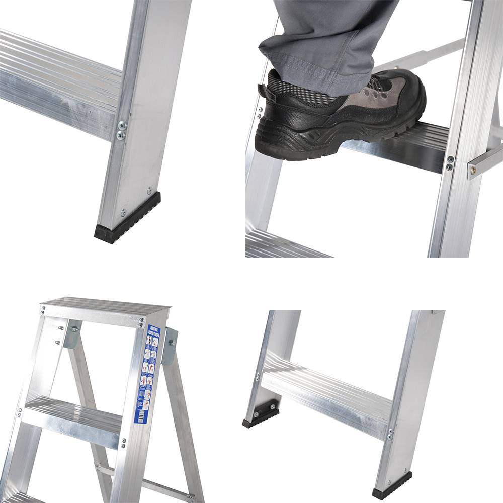Данная модель так же, как и другие, оснащена особенными стопперами, которые предотвращают скольжение ножек лестницы по поверхности, на которой она устанавливается, даже если это скользкий линолеум или плитка. Также, в дополнение к стопперам идут ремни-растяжки из крепкого капрона, не позволяющие секциям разъезжаются под весом работающего на ней человека. Также стоит отметить, что ступени лестницы оснащены особым рельефным покрытием, что позволяет предотвращать несчастные случаи при подъеме и спуске. Кроме того, данная модель отличается более широкими перекладинами, что увеличивает прочность всей конструкции.