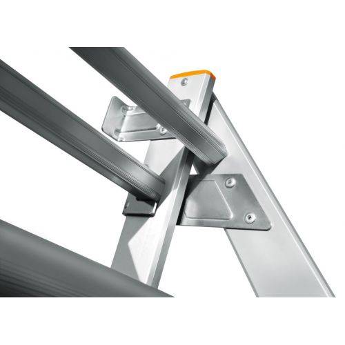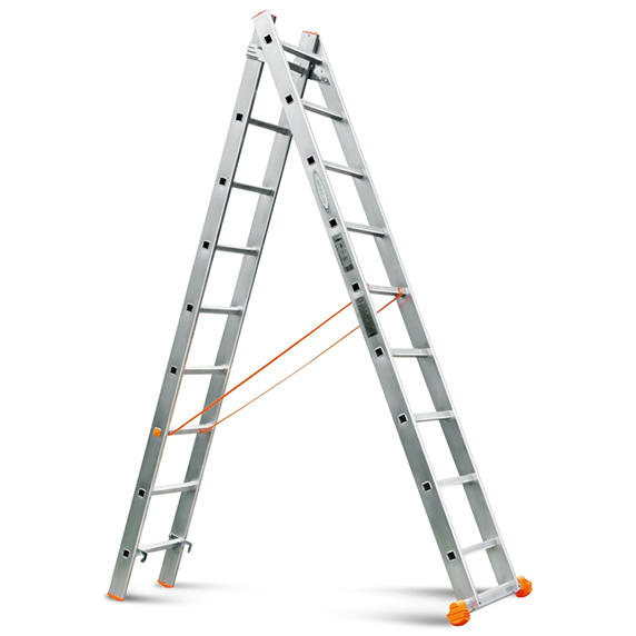 Данная лестница помогает выполнять работы на расстоянии до 6,5 метров от земли. В этой конструкции можно менять конфигурацию, а ее безопасность поддерживают стопорные шарниры из стали.