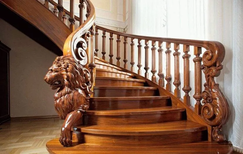 Для деревенского стиля лучший вариант – оформление с элементами из дерева. Этот материал смотрится благородно, позволяет изготавливать балясины любой формы и сложности. Некоторые компании предлагают уже готовые проекты – красивые лестницы со скульптурной резьбой, которые не требуют дополнительного декора.