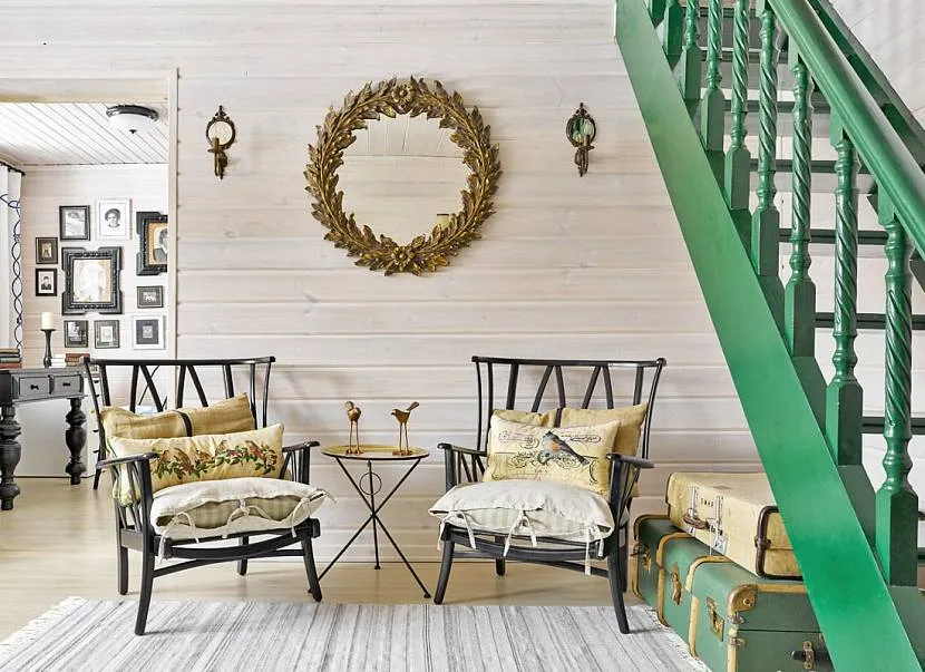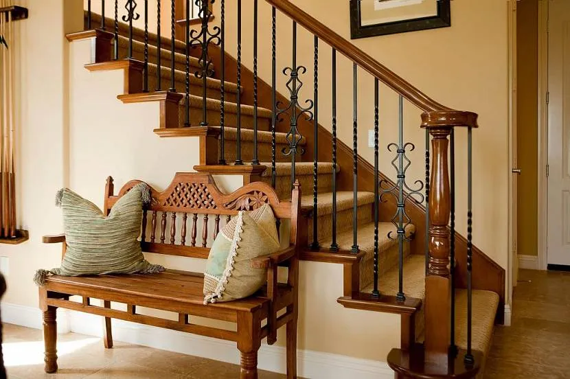 Основными чертами данного дизайна являются всевозможные конфигурации и поверхности с эффектом старины. Подобные изделия помогают создать атмосферу уюта в доме. Необходимо дизайн лестничной конструкции подчеркнуть другими деталями. Это могут быть элементы антикварной мебели или потертые фрески. В старинную обстановку хорошо впишется камень, а также неплохо будет смотреться дерево, либо металл.