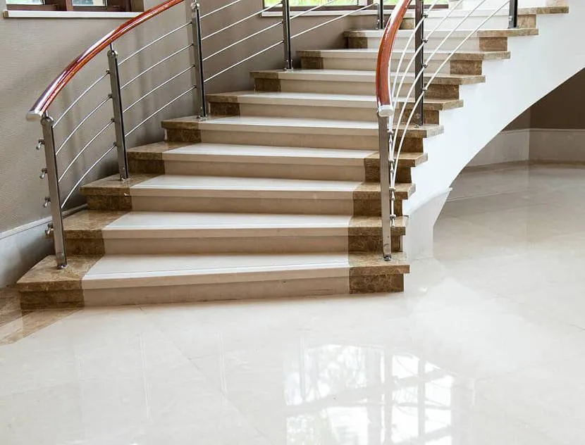 - Гранит, мрамор. Материалам свойственна повышенная прочность за счёт своего вулканического происхождения. Данная характеристика делает эти виды одними из наиболее надёжных и прочных материалов для оформления лестницы. При необходимости облицовки ступеней сложной геометрической формы применяется мрамор. Причина выбора заключается в том, что он легче поддаётся механической обработке.