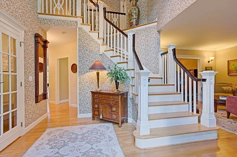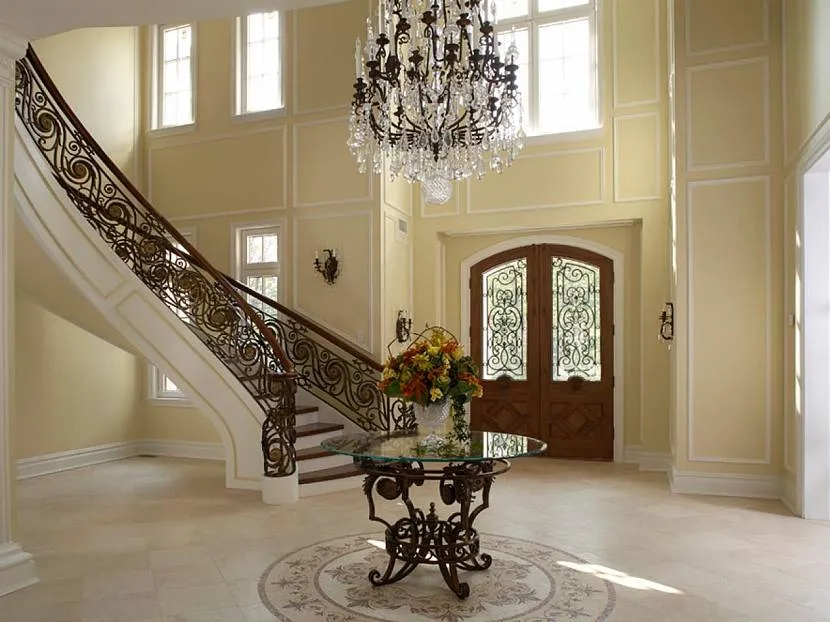 Классический. В качестве отделочных материалов используется мрамор, гранит, дорогие сорта дерева. Оттенок строго нейтральных тонов, декорирование – с помощью балясин, перил, резьбовых фигур, элементов художественной ковки.