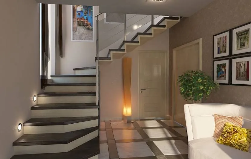 - Для небольшой прихожей или гостиной устанавливается «Г» или «П»-образная лестница с одной площадкой для поворота. Каркас классической конструкции изготавливается из дерева, металла или стекла с последующей облицовкой любыми материалами, соответствующими стилю комнаты.
