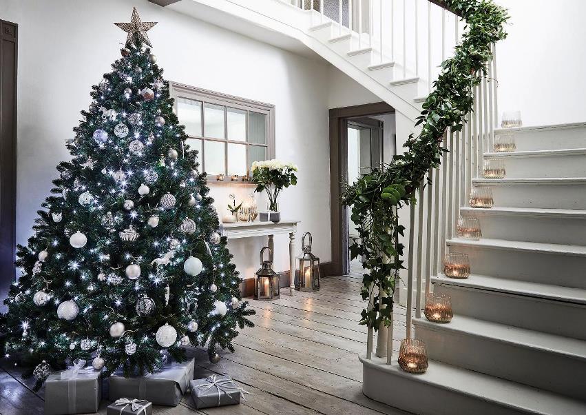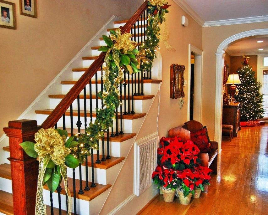 Праздничности лестничному подъему придадут любые источники света. Так что запасайтесь гирляндами: их понадобится много, если вы украшаете крупную лестницу. Первый способ декора – обвить гирляндами все перила и перекладины.