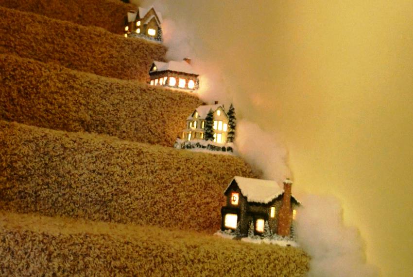 А как вам такой уютный декор? На каждой ступеньке автор разместил небольшие домики с внутренней подсветкой, а остальное пространство заполнил ватой, имитирующей снег. Очень оригинально и по-зимнему.