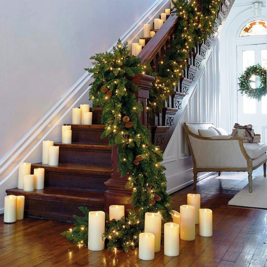 На следующем новогоднем фото каждая ступенька освещена с помощью свечи в крупном подсвечнике. Если вы тоже планируете украсить лестницу свечами, советую вам именно такой вариант: воск не будет капать на поверхность, а за счет высоких стенок подсвечника будет обеспечена пожарная безопасность декора.