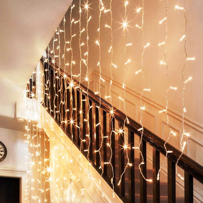 Максимум света и радости придаст такой дизайн, как на фотографии: сделайте шторку из гирлянд по всей высоте перил. В вечернее время, когда другие источники света в доме будут приглушены, такие ступеньки будут выглядеть особенно нарядными.