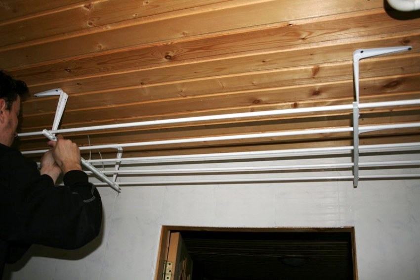 Поскольку все работы будут проводиться на высоте, для удобства следует использовать стремянку высотой до 2 м, на верхней площадке которой можно положить инструменты, которые всегда будут под рукой. Монтаж сушилки начинается с разметки расположения потолочных кронштейнов, которые располагаются на расстоянии, равном длине перекладин.