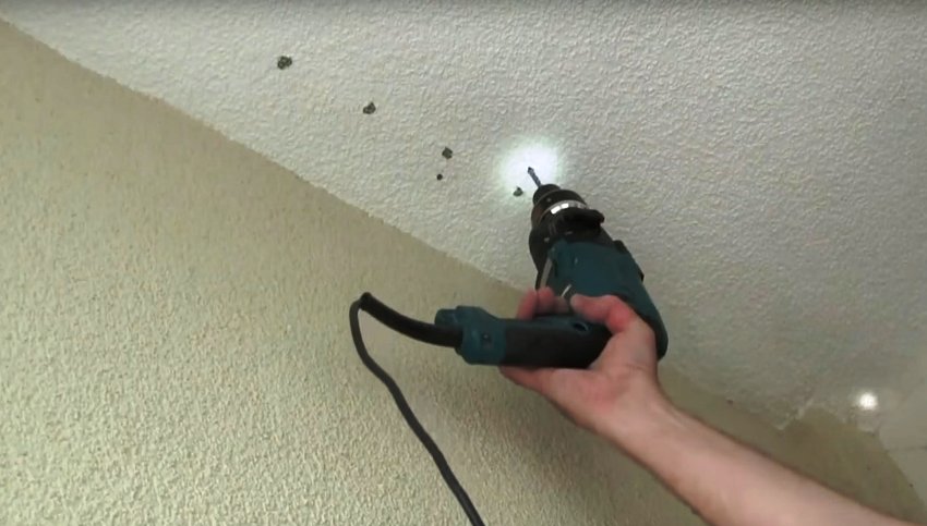 - В отмеченных точках просверливаются отверстия и вставляются дюбеля;