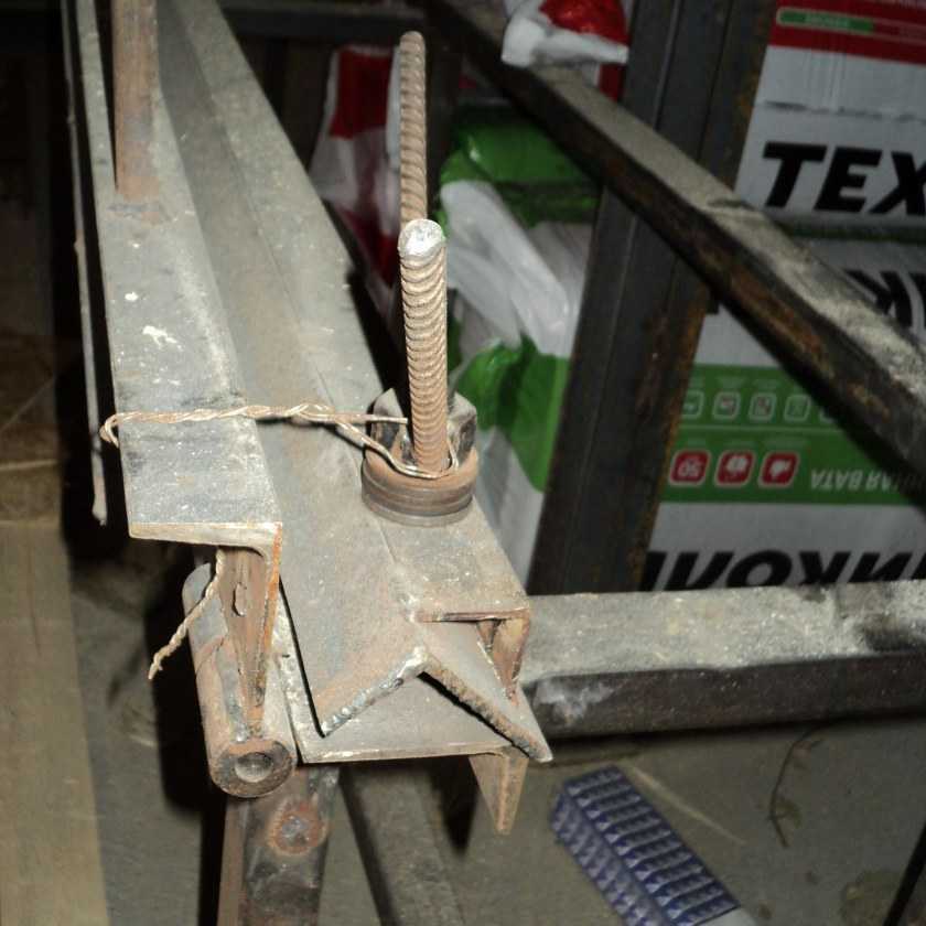 - Чтобы разместить болт, фиксирующий прижимные планки, вырезаются четыре треугольные укосины и привариваются по паре с каждой из сторон двутавра. К укосинам также приваривается гайка.