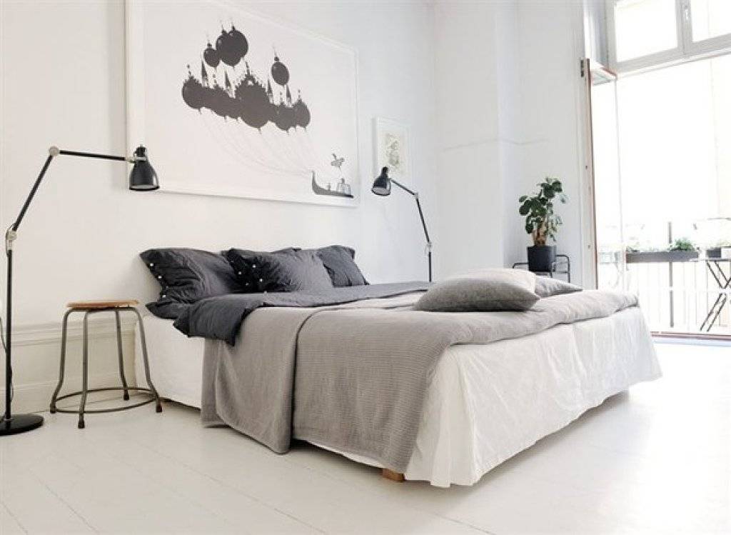 Оптимальное решение для небольшой спальни — торшер. Он не загромождает столик, его легко переставить и одновременно использовать для прикроватного освещения.