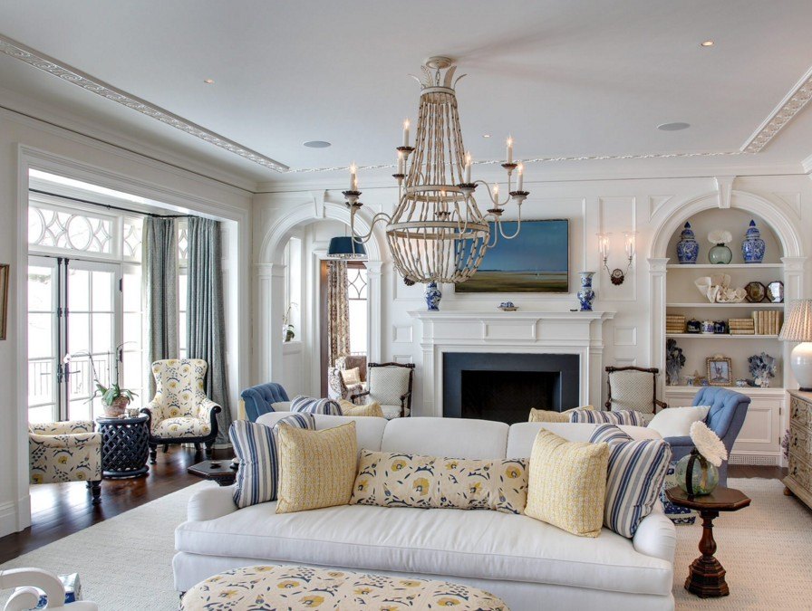 На фото гостиная в стиле прованс с потолком, оформленным резной люстрой светлого оттенка.