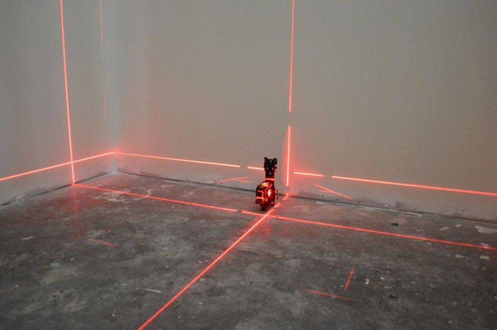 Лазерный уровень стоит поставить рядом с противоположной стеной от той, где будет проводиться разметка.