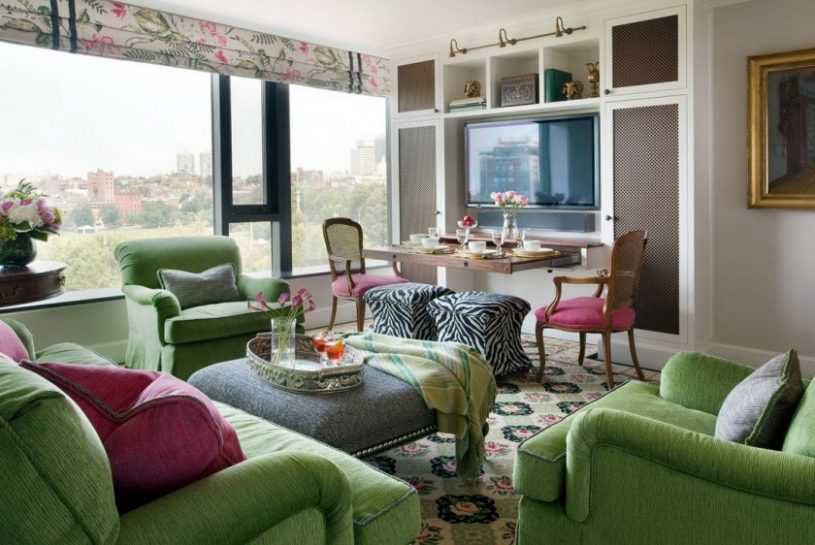 - Зеленый цвет обивки хорошо смотрится при оформлении стен в коричневых тонах, а красный станет ярким акцентом гостиной. Его можно совместить с серым или бежевым оформлением комнаты.