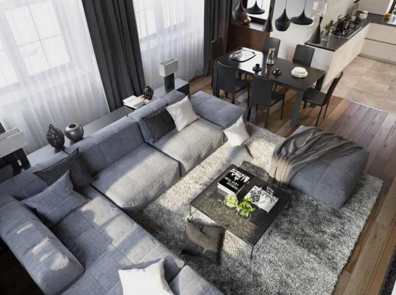 - если гостиная совмещается с кухней, спальней или другой комнатой, то актуально ставить мягкие уголки для зала непосредственно в середине помещения, что позволяет визуально разделить пространство на отдельные сегменты;