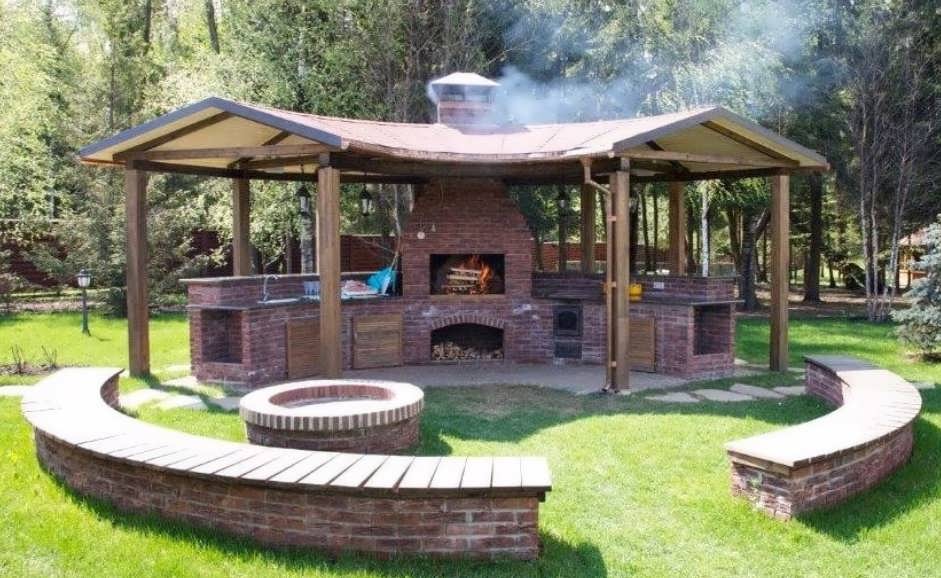 - закрытая зона обустраивается стационарным очагом, имеет навес и стены. Часто для организации такой зоны отдыха служит беседка или терраса, которые фактически превращаются в удобную летнюю столовую, где будет комфортно готовить пищу и обедать при любых погодных условиях;