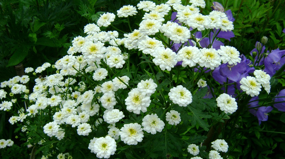 Пришедшая к нам с Кавказа, матрикария бальзамическая выращивается на клумбах страны как высокорослый многолетник. Длина стеблей этого растения достигает 1,5 м в высоту, щитковидные соцветия имеют белый оттенок, но ближе к осени лепестки бутонов окрашиваются в коричневатый цвет. Пиретрум бальзамический неприхотлив к почве, может произрастать как на сухих, так и на хорошо увлажненных участках. Высаживая это растение на клумбу, старайтесь подобрать хорошо освещенное место, на крайний случай клумба может быть расположена в небольшой полутени.