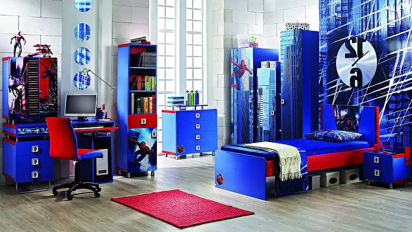 На фото интерьер детской в стиле Человек-паук с применением не только изображений, но и цветового сочетания в мебели.