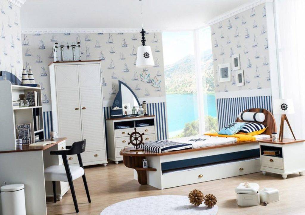 Для обустройства помещения для школьника в морском стиле имеются несколько вариантов отделки. Можно воссоздать капитанский мостик или каюту лайнера, а можно устроить лишь легкое напоминание о море с помощью подходящего текстиля или обоев. Решающим выступает мнение ребенка.
