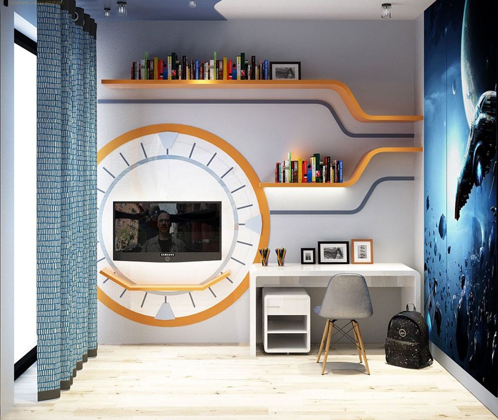 Комнату школьника необходимо спланировать таким образом, чтобы рабочее место было уединенным, тем самым, отгородив его от отвлекающих предметов. Место должно быть оснащено полками для книг и тетрадей. Рабочую зону следует оформить цветами, которые способствуют мозговой активности и концентрации внимания. Это может быть желтый, зеленый, оранжевый или синий. Можно использовать в качестве декора образовательные предметы, такие как глобус, модель Солнечной системы, картины, интерьерные цифры и буквы. Нельзя забывать о качественном освещении рабочего места, чтобы ребенку было комфортно и приятно заниматься.