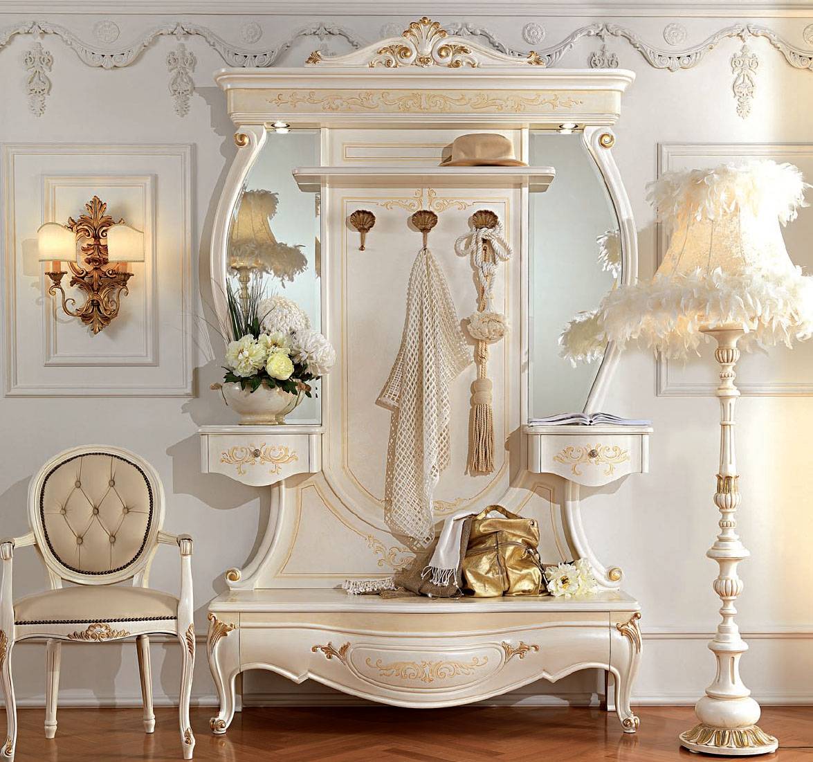 Цвет мебели может быть белым с позолоченными контурами. Допускается использовать натуральную древесину без окраски. Все модули украшены лепниной, есть карнизы, колонны.