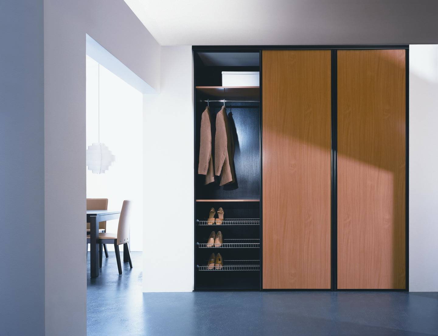 Встроенный вариант тоже может иметь раздвижные дверцы. Такая мебель не занимает много места. Ее глубина должна регулироваться только свободными метрами прихожей. Не сложно самому организовать встроенную систему хранения, чертежи которой можно найти в тематических журналах и книгах.