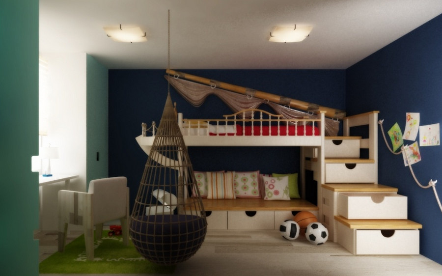 Иногда будет правильно сделать мебель самостоятельно, в этом случае фантазия станет хорошим помощником. Например, кровать в виде автомобиля, качелей или корабля, все это оригинальные и уместные идеи, которые разнообразят интерьер, сделают его веселым и немного сказочным.