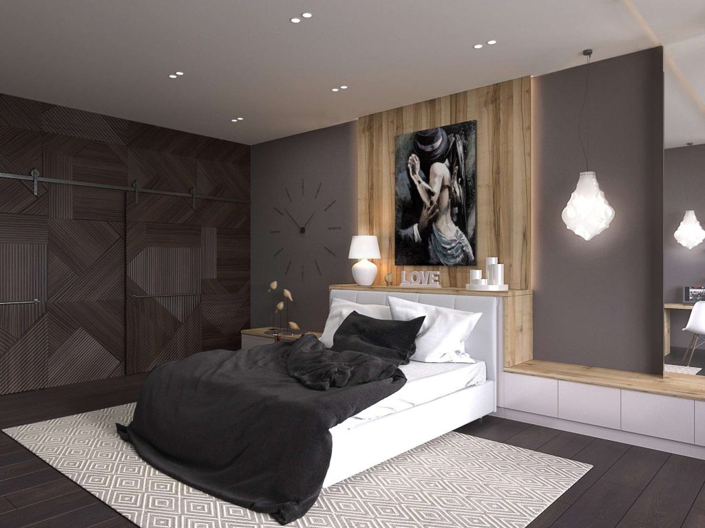 Интересным визуальным цветовым решением является использование в дизайне современного интерьера белого цвета совместно с черным или темно-коричневым. Также отлично смотрится темный пол со светлыми стенами. Не забывайте и о настенных декоративных элементах, среди которых может быть цикл небольших картин, развешанных над кроватью, или разнообразные фотографии. Очень хорошо будет смотреться абстракция и простые сюжеты.