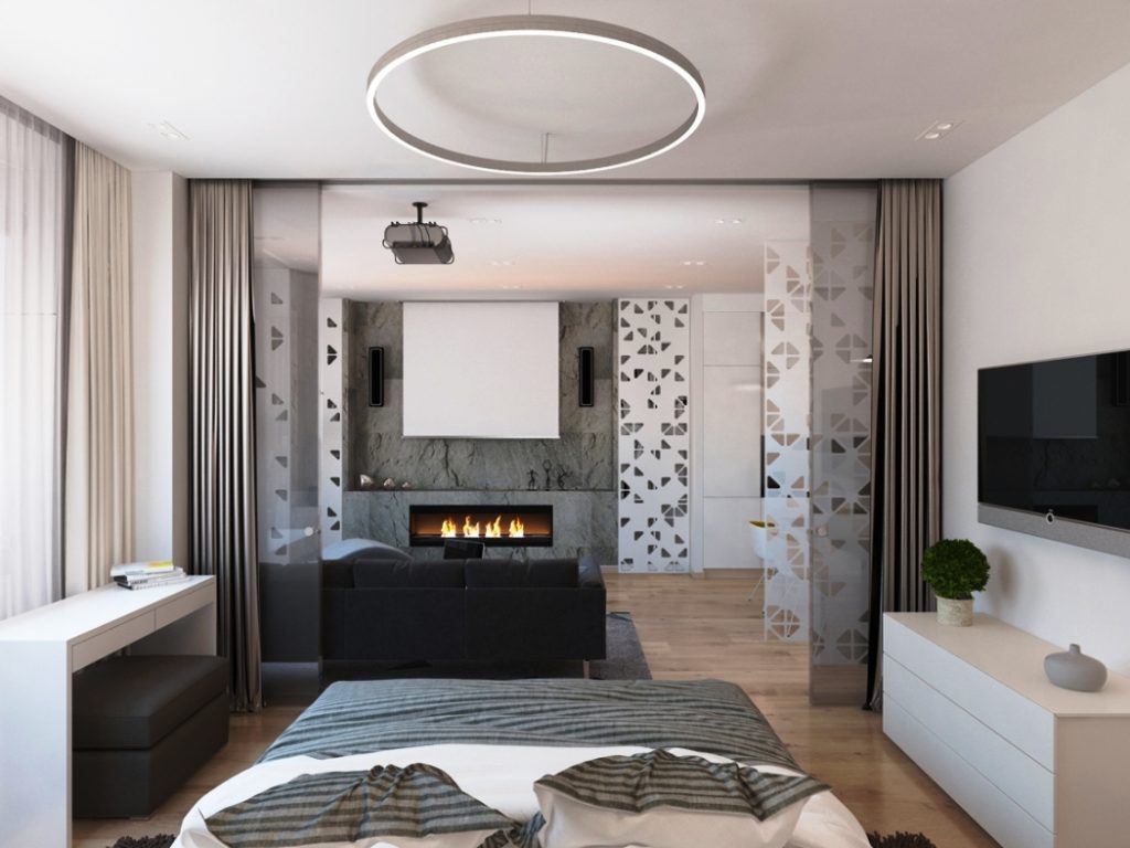 В случае если спальная комната будет совмещена с рабочим кабинетом или с гардеробной комнатой, важно грамотно разделить зоны так, чтобы ничего не мешало крепкому сну. Далее нужно определиться с видами отделки