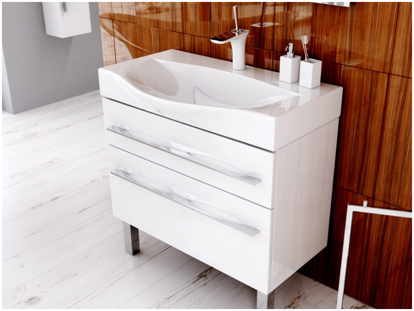 На эти модели обращают внимание в первую очередь. Многообразие напольной мебели позволяет выбрать комплект как для просторной, так и небольшой ванной комнаты