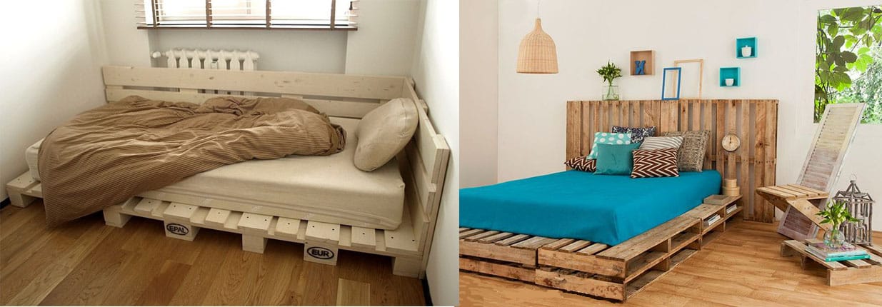 Эти использованные изделия неплохо подходят в качестве основания для спального места. Если есть желание иметь в своем интерьере низкую кровать, оформленную в азиатском стиле, то на месте ее основания нужно поставить в ряд несколько паллет. Можно использовать и другой вариант: соорудить из поддонов два или три яруса и закрепить их с помощью деревянных подставок – таким образом можно получить спальное место в классическом стиле. Преимущество такой кровати заключается в том, что у нее отличная вентиляция, а недостаток – нельзя оказывать большую нагрузку, так как существует большая опасность разрушения конструкции: доски не выдержат и могут сломаться.