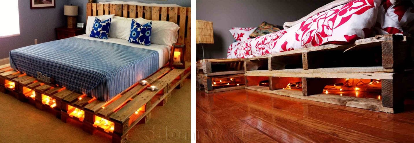 Уже готовую кровать можно не только украсить различными орнаментами, но и сделать из нее полноценный ночник. Внутрь конструкции можно с легкостью разместить светодиодные схемы, которые будут при помощи длинного шнура и вилки функционировать в темное время суток. Крепление производится во внутреннюю часть кровати. Поблизости должна быть свободная розетка для того, чтобы не было необходимости лишний раз покидать спальное место. Цветной или белый рассеивающийся свет преобразит помещение до неузнаваемости и придаст необходимого уюта и тепла. Изголовье кровати из паллетов также можно оснастить подсветкой.