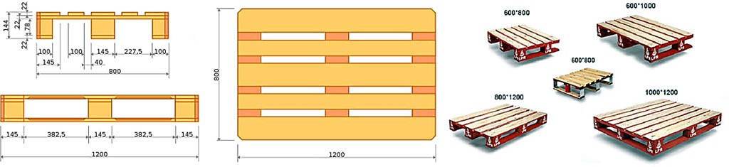 Чаще всего встречаются поддоны двух видов стандартные (120х100х12 см) и евро поддоны (120х80х12 см). Их вес в среднем составляет 15-20 килограмм. Для изготовления используют древесину сосны, липы, дуба.