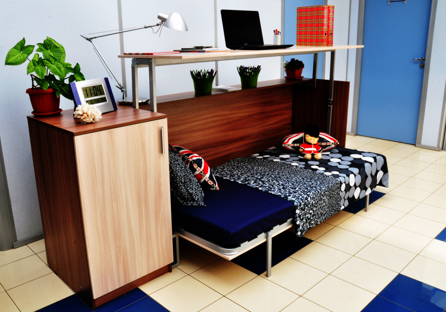 Трансформирующаяся мебель, имеет многоцелевое назначение, ее легко убрать, когда она не нужна. Одним из таких решений стала кровать трансформер совмещенная со шкафом, ночью она используется в качестве кровати для сна, а утром благополучно убирается в шкаф или легким движением руки превращается в письменный стол. Что называется: голь на выдумки горазда.
