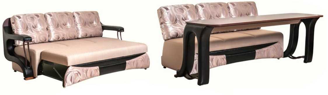Диван со столом. Этот вариант, скорее экзотика. Не так высока его функциональность. Но как вариант нестандартной мебели он хорош. Диван-стол имеет подвижную спинку из дерева (или его заменителей) или пластика. Пока мебель трансформер используется как мягкая мебель, внешних отличий нет. При необходимости спинка перекидывается вперед, где упирается в пол.